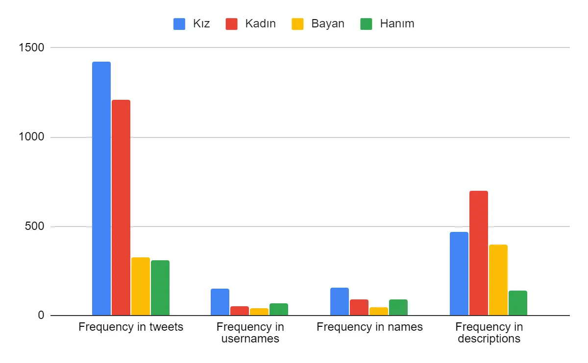 In regards to the second question, the most interesting difference was found in regards to the word kız ‘girl’, which was the most frequent feminine term in tweets, names and usernames but was surpassed by kadın ‘woman’ in profile descriptions. This could indicate the pervasive use of ‘girl’ when referring to women by others, but a greater willingness to use ‘woman’ when describing oneself. Feminine versions of specific terms also had a generally slightly higher frequency in profile content than tweets, indicating that women are more likely to use these terms to refer to themselves than people in general are to others.